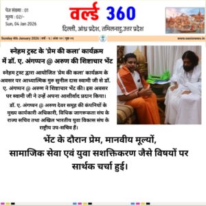 स्नेहम ट्रस्ट द्वारा आयोजित ‘प्रेम की कला’ कार्यक्रम के अवसर पर प्रसिद्ध आध्यात्मिक गुरु सुनील दास स्वामी जी से डॉ. ए. अंगप्पन @ अरुण ने शिष्टाचार भेंट की। इस आत्मीय मुलाक़ात के दौरान स्वामी जी ने डॉ. अरुण को आशीर्वाद प्रदान करते हुए प्रेम, करुणा और सेवा के मार्ग पर निरंतर आगे बढ़ने की प्रेरणा दी।