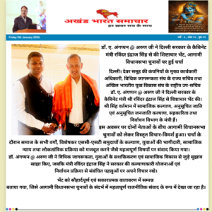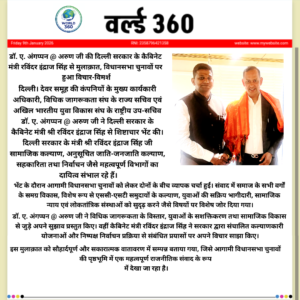 देवर समूह की कंपनियों के मुख्य कार्यकारी अधिकारी, विधिक जागरूकता संघ के राज्य सचिव तथा अखिल भारतीय युवा विकास संघ के राष्ट्रीय उप-सचिव डॉ. ए. अंगप्पन @ अरुण जी ने दिल्ली सरकार के कैबिनेट मंत्री श्री रविंदर इंद्राज सिंह से शिष्टाचार भेंट की। श्री सिंह वर्तमान में सामाजिक कल्याण, अनुसूचित जाति एवं अनुसूचित जनजाति कल्याण, सहकारिता तथा निर्वाचन विभाग के मंत्री हैं।