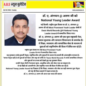 डॉ. ए. अंगप्पन @ अरुण जी को Oasis World Records द्वारा National Young Leader Award से सम्मानित किया गया