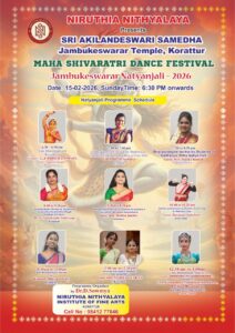 மகா சிவராத்திரி புனித நாளை முன்னிட்டு சென்னை கொரட்டூரில் அமைந்துள்ள Arulmigu Sri Akilandeswari Sametha Jambukeswarar Temple திருக்கோவிலில் “ஜம்புகேஸ்வரர் நாட்டியாஞ்சலி” நிகழ்ச்சி ஆன்மிக நம்பிக்கையுடனும் கலாசார மரபுடனும் சிறப்பாக நடைபெற்றது. நிருத்திய நித்யாலயா ஏற்பாடு செய்த இந்நிகழ்வில் பரதநாட்டியத்தின் கலைநயம் பக்தி சூழலை மேலும் சிறப்பித்தது.