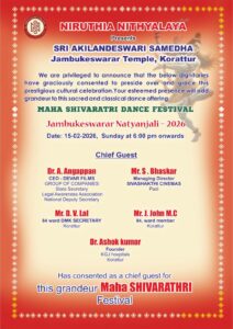 மகா சிவராத்திரி புனித நாளை முன்னிட்டு சென்னை கொரட்டூரில் அமைந்துள்ள Arulmigu Sri Akilandeswari Sametha Jambukeswarar Temple திருக்கோவிலில் “ஜம்புகேஸ்வரர் நாட்டியாஞ்சலி” நிகழ்ச்சி ஆன்மிக நம்பிக்கையுடனும் கலாசார மரபுடனும் சிறப்பாக நடைபெற்றது. நிருத்திய நித்யாலயா ஏற்பாடு செய்த இந்நிகழ்வில் பரதநாட்டியத்தின் கலைநயம் பக்தி சூழலை மேலும் சிறப்பித்தது.